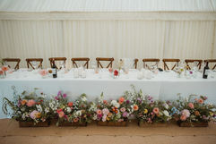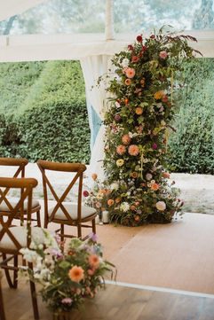 Colourful, natural and just picked from the cutting garden, a mix of the best blooms for this late summer August wedding with dahlias, cosmos, seed heads, grasses and silver birch. The theme ran across all designs from the bouquets to the ceremony arch to the hanging installations.